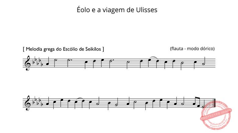 A professora Ivani Almeida Blanco acrescentou alguns versos, que também transformei depois em hexâmetros. A música, tocada como introdução, é a mesma antiga melodia grega do Escólio de Seikilos. Conforme o número de alunos, as personagens farão parte do coro, saindo dele quando tiverem de agir em cena.